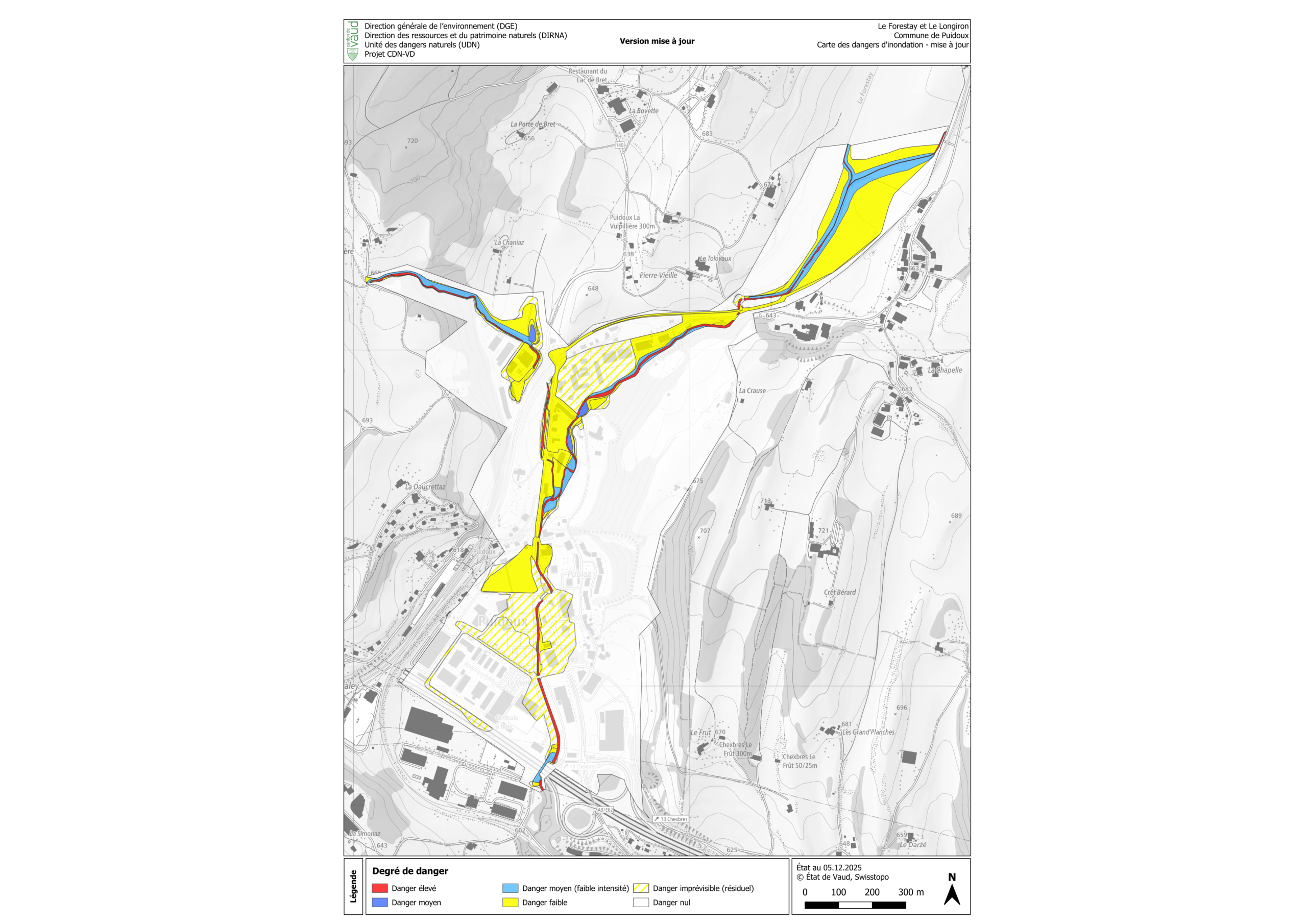 Cartographie du danger d’inondation par les crues et actualisation des produits CDN-VD pour donner suite aux travaux de sécurisation contre les crues du Longiron et du Forestay. Analyse hydraulique/hydrologique, élaboration et évaluation des scénarios et gestion des bases de données.
