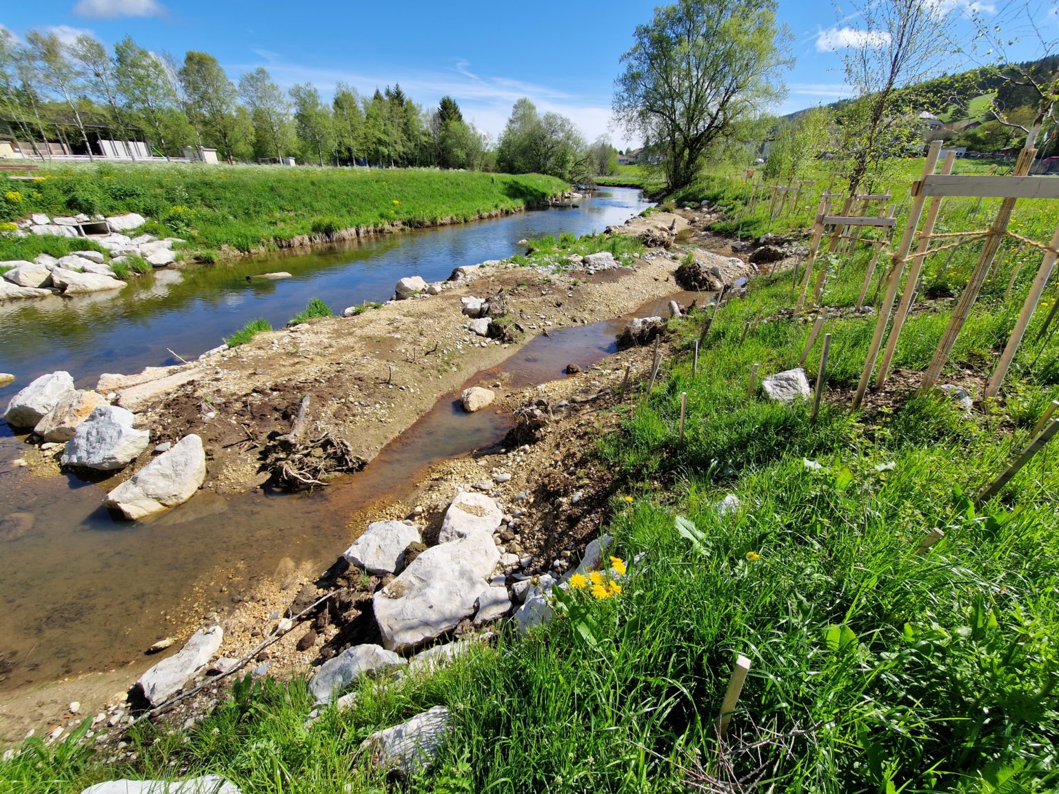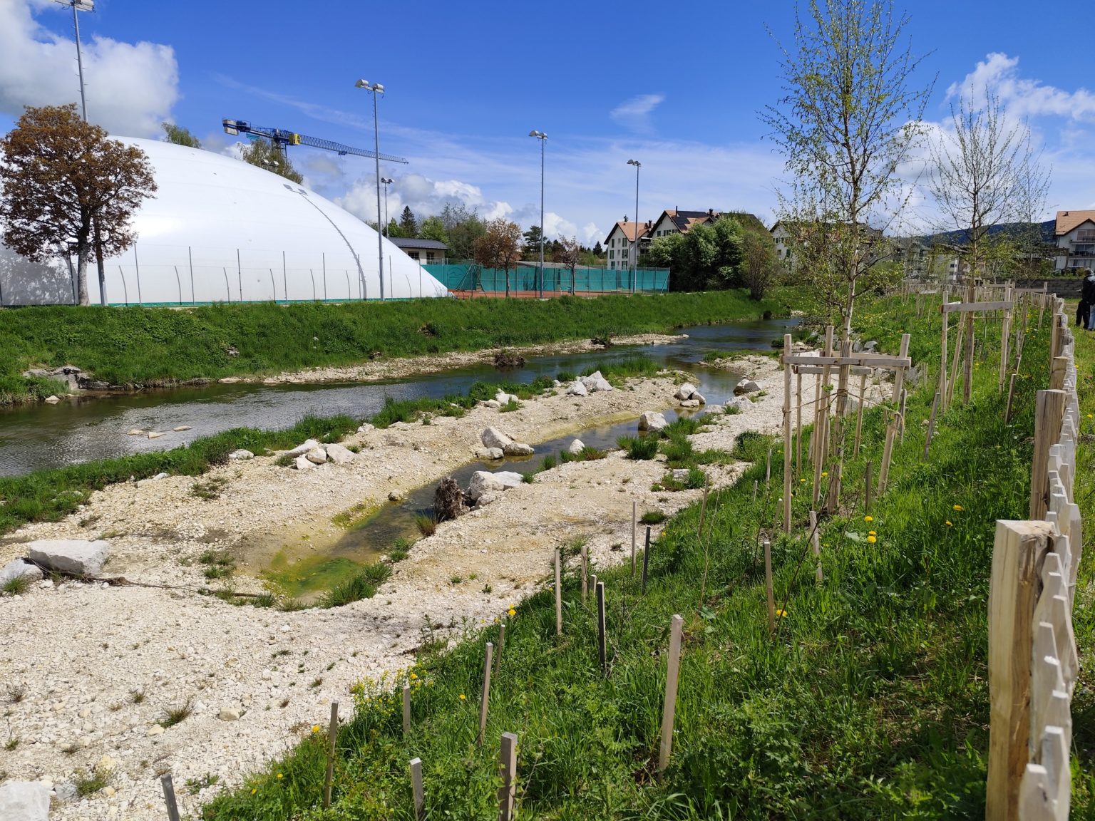 Revitalisation du cours d’eau avec des aménagements du lit permettant d’améliorer les températures et les hauteurs d’eau, des refuges et caches à poissons pour faire face aux faibles débits d’étiage. Création de deux grands élargissements en faveur de la biodiversité. Arborisation massive des berges, réfection de digue, drainage et de chemins.
